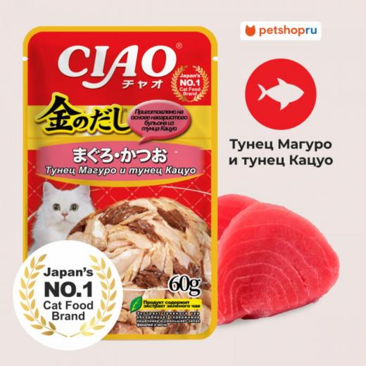 Характеристики Inaba Kinnodashi влажный корм для кошек, тунец магуро и тунец кацуо (60 гр)
